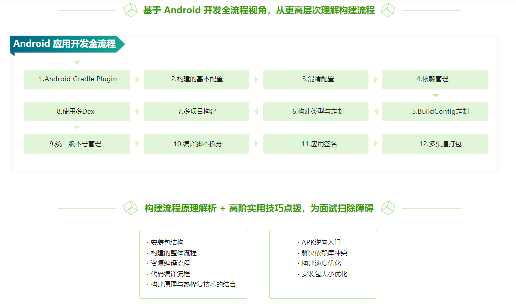 本课程基于最新构建工具链,以一个页面路由框架的开发-发布为主线,将实战与理论相结合,深度学习 Gradle 及时下热门的编译时注解处理、字节码插桩等高级技术,带领大家系统化掌握 Android 应用构建知识,提升开发效率。