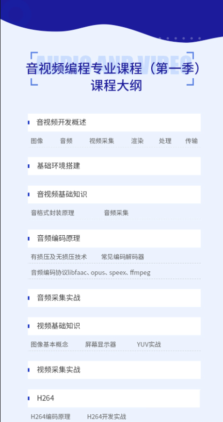 系统讲解声音视频开发的原层原理、开发技术及框架应用,包括音视频的采集、编码、解码、H264、音视频渲染处理、音视频数据打包传播、FFmpeg框架应用、RTMP流媒体等等,并带领大家完成播放器、视频会议系统及在线教育直播系统、泛娱乐直播平台等四个综合应用项目实战。