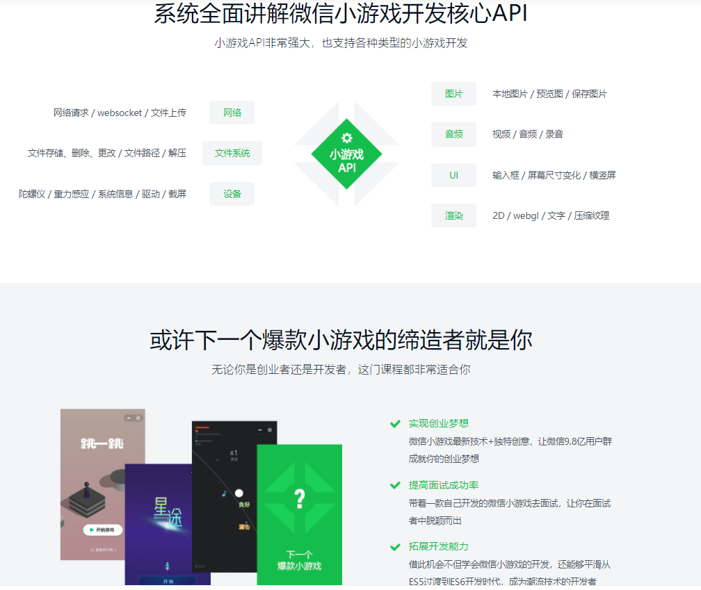 微信小游戏以自己的独特的方式切分了手机游戏商场这块大蛋糕。本课程从0开始,叙述微信小程序的整个开发过程,所解说内容包含小程序中心API、东西链等小游戏开发中心技术。把握小游戏开发,展现你的构思,与10亿微信用户共享高兴。