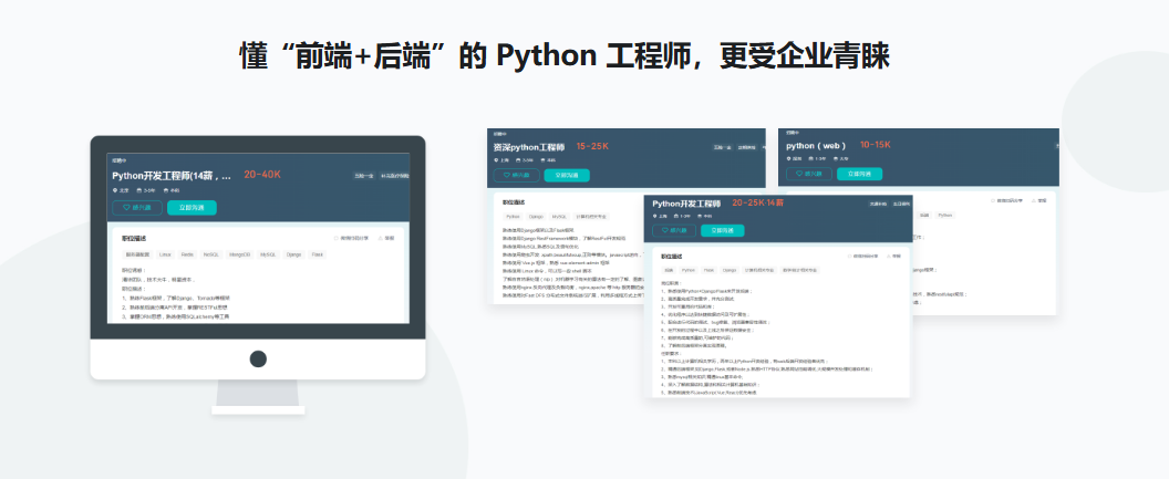 Python Web全栈工程师视频教程。本课完全对标大厂人才标准,2023 全新打造,全面讲解Python Web全栈工程师体系化知识,全新技术版本+企业级项目实战+全栈思维训练,一站式提升职场竞争力一门精深,多领域拓展,夯实迁移能力,挑战高薪岗位!