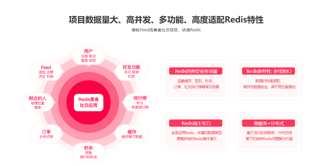 使用Redis轻松应对秒杀、限购等高并发场景,掌握社交中好友与Feed设计开发,利用BitMap完成签到,GEO完成附近的人,同时掌握分布式缓存应用与优化:如何快速写入,缓存淘汰机制,缓存击穿、穿透与雪崩解决方案等